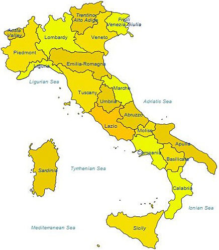 Abruzzo L'Aquila Aosta Valley Aosta Apulia / Puglia Bari Basilicata Potenza Calabria Catanzaro Campania Naples Emilia-Romagna Bologna Friuli-Venezia Giulia Trieste Lazio Rome Liguria Genoa Lombardy Milan Marches Ancona Molise Campobasso Piedmont Turin Sardinia Cagliari Sicily Palermo Tuscany Florence Trentino-Alto Adige Trento Umbria Perugia Veneto Venice