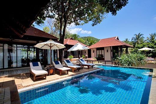 This two-bedroom villa of grand proportions is in a U-shape facing the beach, palm trees, and the Andaman Sea. Bedroom suites are housed in southern Thai-style buildings either side of a courtyard with double size garden sala.