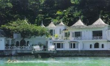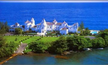 Trident Castle is an 8-bedroom real castle standing on 7 acres of a peninsula in Port Antonio, Jamaica. 2-20 people can rent this 40,000 ft² Castle with a staff of 7. A 22 feet long banquet table that seats 30 people, with a 10 feet high Baccarat crystal