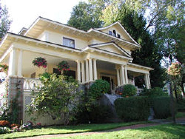 Built in 1908, this Queen Anne style home has operated as a Bed and Breakfast since 1987. Come relax on our oversized wrap-around porch with 23 columns or the backyard terrace pictured here. Visit the shade garden on the west side of the house.We are loca